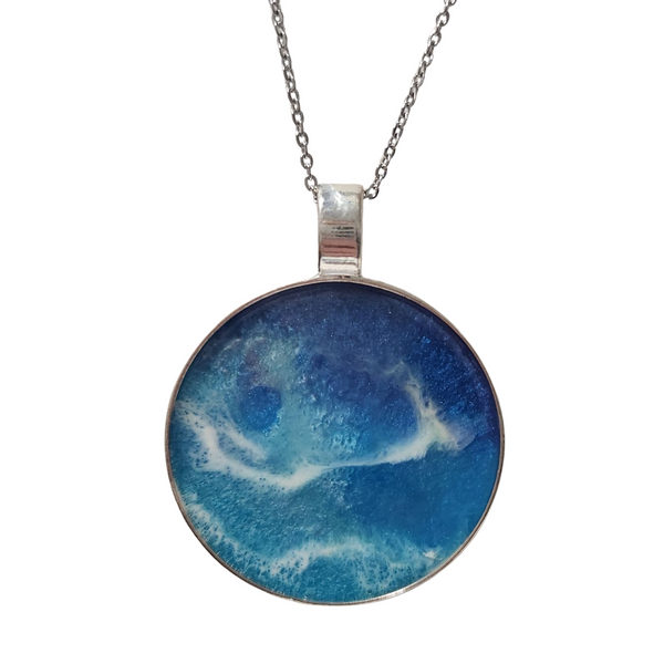 White resin is used to create crashing wave effects, resulting in soft foam textures and shoreline-style movement. Because each pour reacts uniquely, every necklace is completely one of a kind, with its own ocean color blend, wave pattern, and flow.