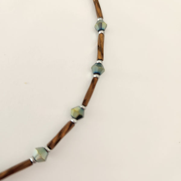 Handcrafted with rich brown twisted bugle beads paired with iridescent green faceted beads that shift between gold, green, and hints of blue, this anklet glows softly in the light. Small silver spacer beads tie the design together, giving it a polished and elegant finish.