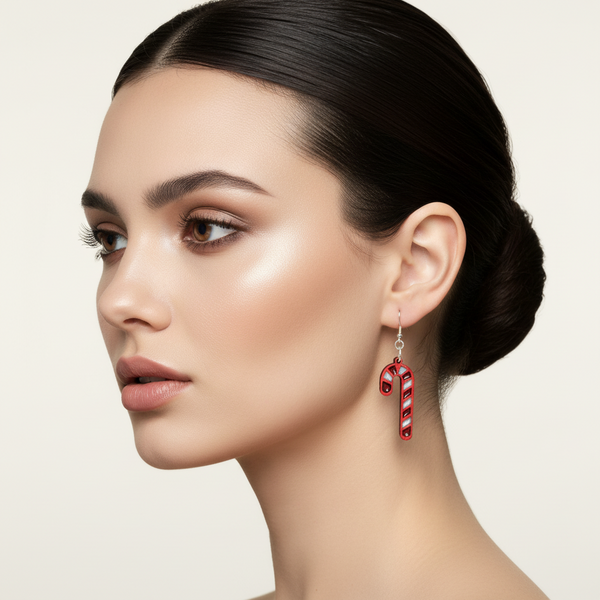 Each pair is laser-cut from wood, then hand-painted and filled with glossy red and white resin to create a vibrant, candy-stripe look that shimmers in the light. The combination of natural wood and resin gives these earrings a charming handcrafted texture with a festive sparkle.