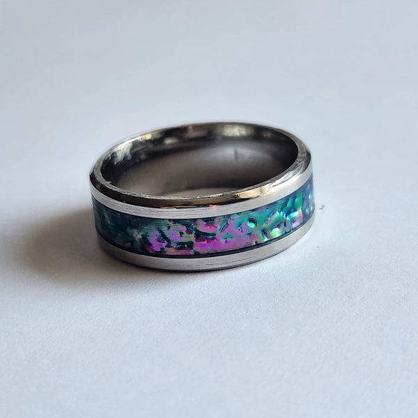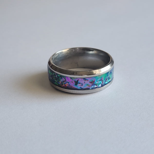 The color is primarily purple, but the magic is in the movement—when the light hits the band, it shifts to vibrant blues and greens, creating a mesmerizing iridescent effect. No two rings ever look the same, making this a perfect statement piece for anyone who loves unique, handcrafted jewelry.