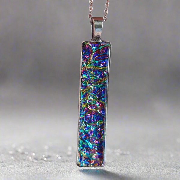 Bold, iridescent, and beautifully modern — this Red Burl Dichrolam Necklace from Blue Bourbon Designs features genuine Dichrolam dichroic material set inside a sleek rectangular metal bezel and sealed under a smooth layer of crystal-clear resin. The result is a striking pendant that shifts and changes color as it moves, glowing with sparkling blue, green and purple highlights