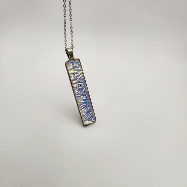 Bold, iridescent, and beautifully modern — this Caribbean Burl Dichrolam Necklace from Blue Bourbon Designs features genuine Dichrolam dichroic material set inside a sleek rectangular metal bezel and sealed under a smooth layer of crystal-clear resin. The result is a striking pendant that shifts and changes color as it moves, glowing with shimmering white with hues of blues and some purples