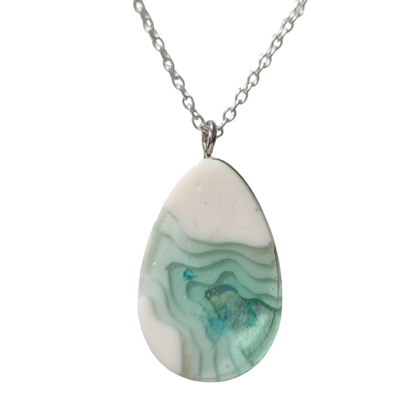 Available in several shapes — diamond, rectangle, round, teardrop, and half-circle — every pendant hangs from a silver stainless steel chain, durable and hypoallergenic.