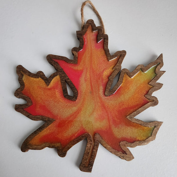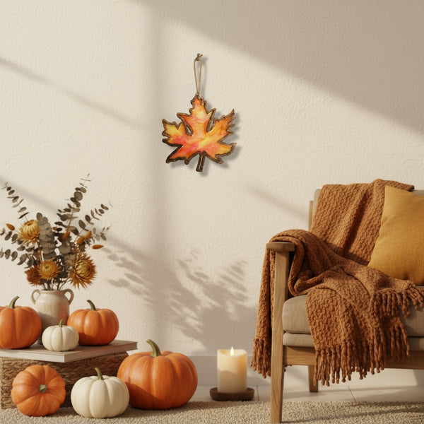 Every maple leaf is one-of-a-kind, featuring unique color blends and resin patterns — no two are ever exactly alike. A small twine rope hanger adds a natural finishing touch and makes it easy to display this seasonal piece on your wall, door, or mantel.