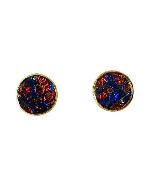 Unique, vibrant, and full of shimmering color — these Limited Edition Dichroic Stud Earrings from Blue Bourbon Designs are small treasures that stand out beautifully. Each pair features 12mm round dichroic material, known for its color-shifting, glasslike sparkle. Every piece is carefully set and then sealed in crystal-clear resin, creating a glossy, domed finish that enhances the depth and iridescence of the dichroic design.