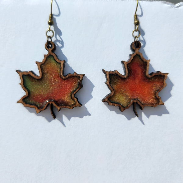 Because each resin pour is different, no two pairs are alike — giving you truly one-of-a-kind maple leaves with their own natural-looking variation and depth. Lightweight and comfortable, the earrings hang from warm brass hooks, which complement both the wood and the autumn-inspired tones perfectly.