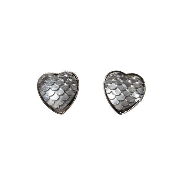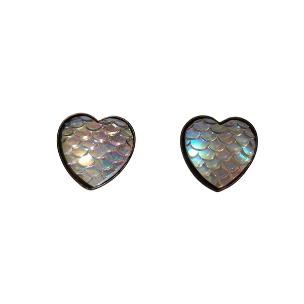 Shimmery, magical, and full of iridescent color — these Mermaid Scale / Dragon Scale Heart Earrings from Blue Bourbon Designs are tiny statement studs that catch the light beautifully from every angle. Each pair features a vibrant, scale-textured cabochon set inside a silver or gold stainless steel heart bezel, creating the perfect mix of fantasy charm and everyday wearability.