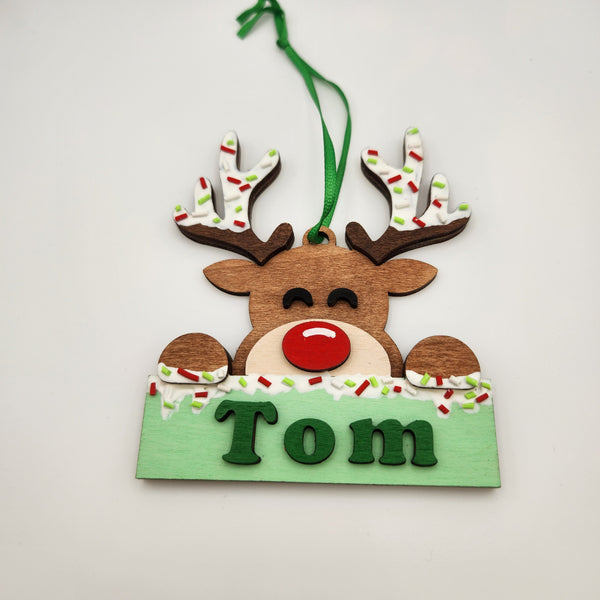 Each ornament is laser cut from wood and hand-painted in classic holiday colors of red and green, creating a festive and timeless look. Every reindeer is finished with a coordinating hanging ribbon, ready to display on your tree or give as a thoughtful, personalized gift.