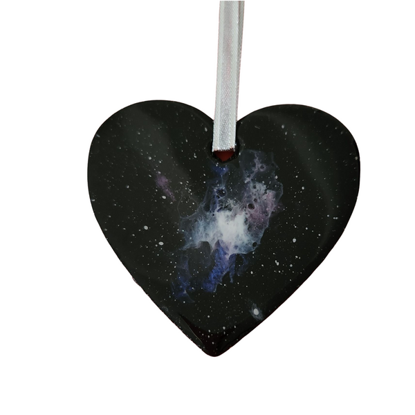 Each ornament begins as a wooden heart base, then layered with hand-poured resin to create a mesmerizing galaxy effect. A deep black resin base provides the perfect backdrop for swirling shades of blue, pink, and purple, accented by soft white “clouds” that give the illusion of floating nebulae.