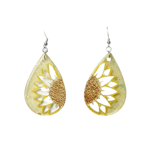 Hand-poured resin teardrop earrings made with a sunflower mold