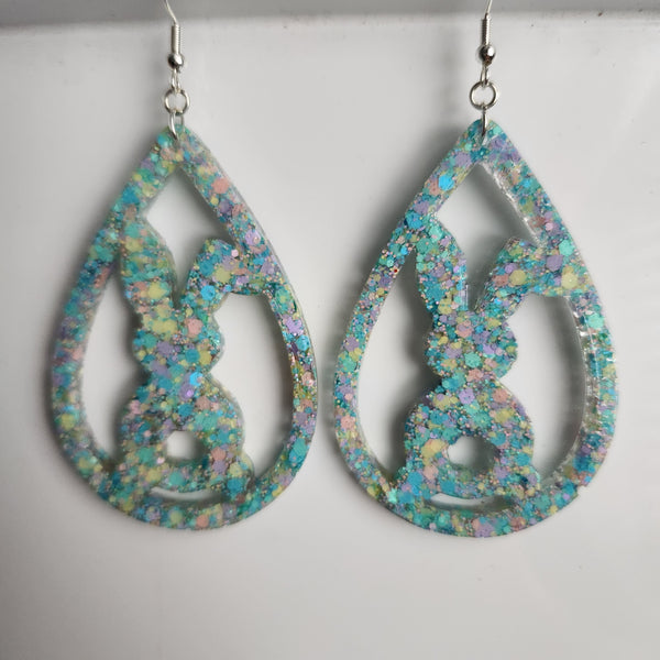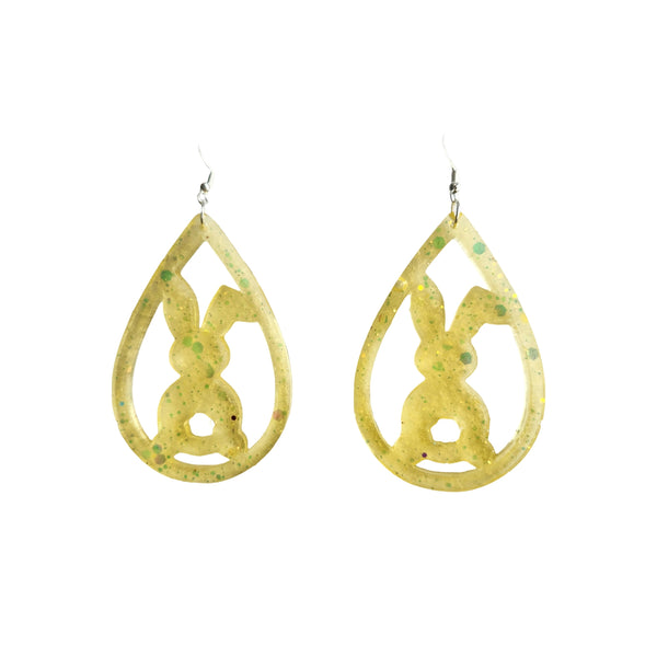 Add a playful pop of color to your style with these whimsical Teardrop Rabbit Dangle Earrings from Blue Bourbon Designs. Each pair is handcrafted from translucent resin, swirled with fun colors and sparkling glitter that shimmer beautifully when they catch the light.