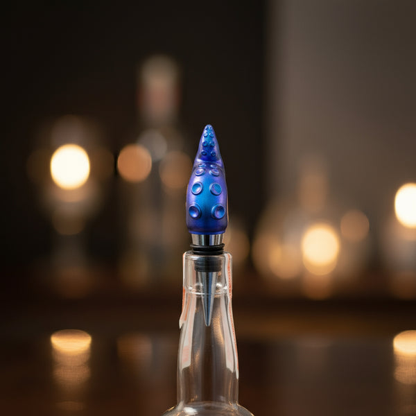This stopper features a hand-poured resin top shaped like a tentacle, with a mesmerizing color-shifting finish that transitions from deep blue to rich purple depending on the light. The effect creates a dynamic, almost magical shimmer — making it as much a conversation piece as it is a functional bar accessory.