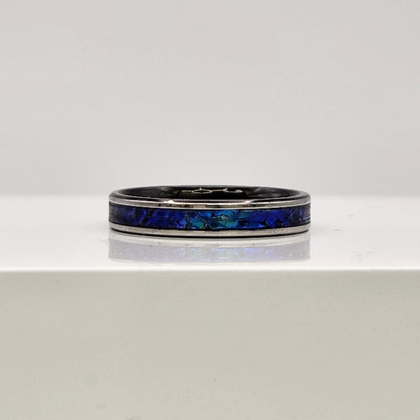 The color is primarily blue, but when the light hits just right, it shifts into light blue and green tones, creating a mesmerizing, iridescent glow. No two rings are ever identical, making every piece a one-of-a-kind wearable artwork.