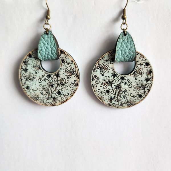 The wooden circles are then hand-painted in a blueish-green shade, giving the earrings a soft, earthy pop of color while still allowing the engraved floral pattern to stand out. At the top, a matching leather tab ties the design together, adding an element of texture and a cohesive color palette.