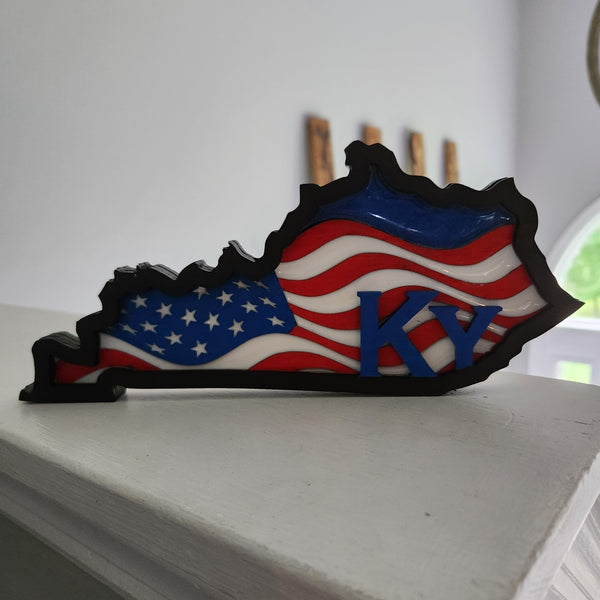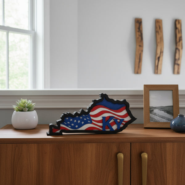 Each piece is crafted from three layers of laser-cut wood, precisely shaped in the outline of Kentucky and then hand-poured with resin to create a beautiful, glossy American flag design. The mix of painted wood and vibrant resin gives every piece striking depth, color, and texture — making it a true one-of-a-kind work of art.