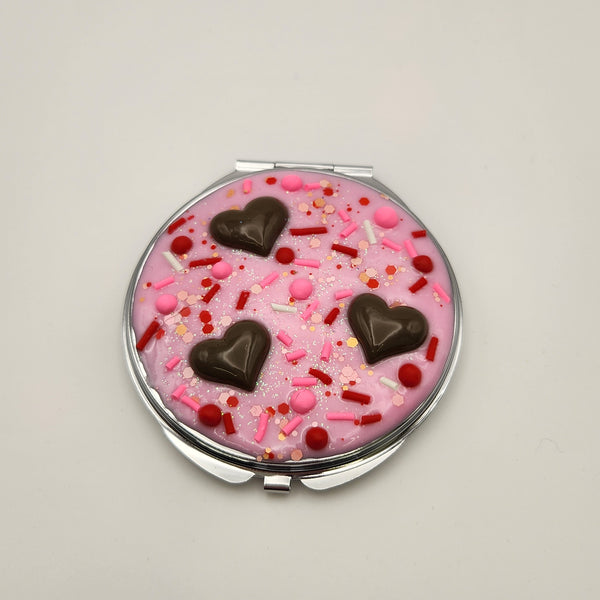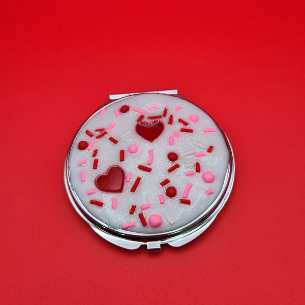 Each compact is handcrafted by hand using resin faux frosting and topped with handmade faux playful sprinkles and heart accents. Designed to look like a frosted Valentine dessert, no two mirrors are ever exactly alike — making each one truly one-of-a-kind.